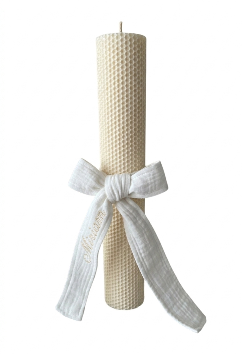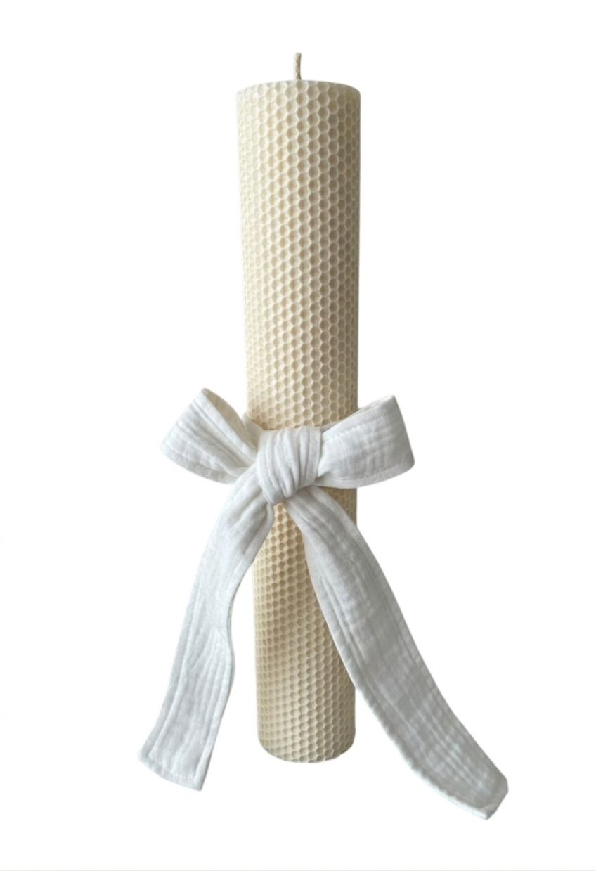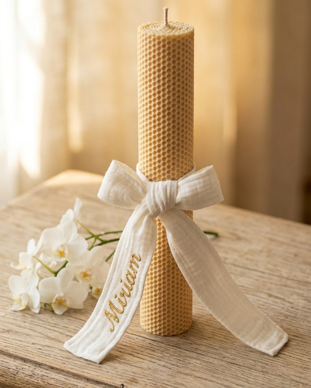 Lumânarea de botez este simbolul luminii și al purității, iar varianta noastră din ceară naturală aduce acestui moment o notă de autenticitate ireproșabilă. Spre deosebire de lumânările clasice din parafină, ceara naturală de albine oferă o culoare caldă, textură fină și un parfum discret, natural. Designul este completat de o fundiță delicată din muselină, un material recunoscut pentru finețea sa extremă. Textura ușor creponată și aerată a muselinei oferă lumânării un aspect boem și sofisticat, fiind accesoriul ideal pentru a întregi trusourile noastre premium.