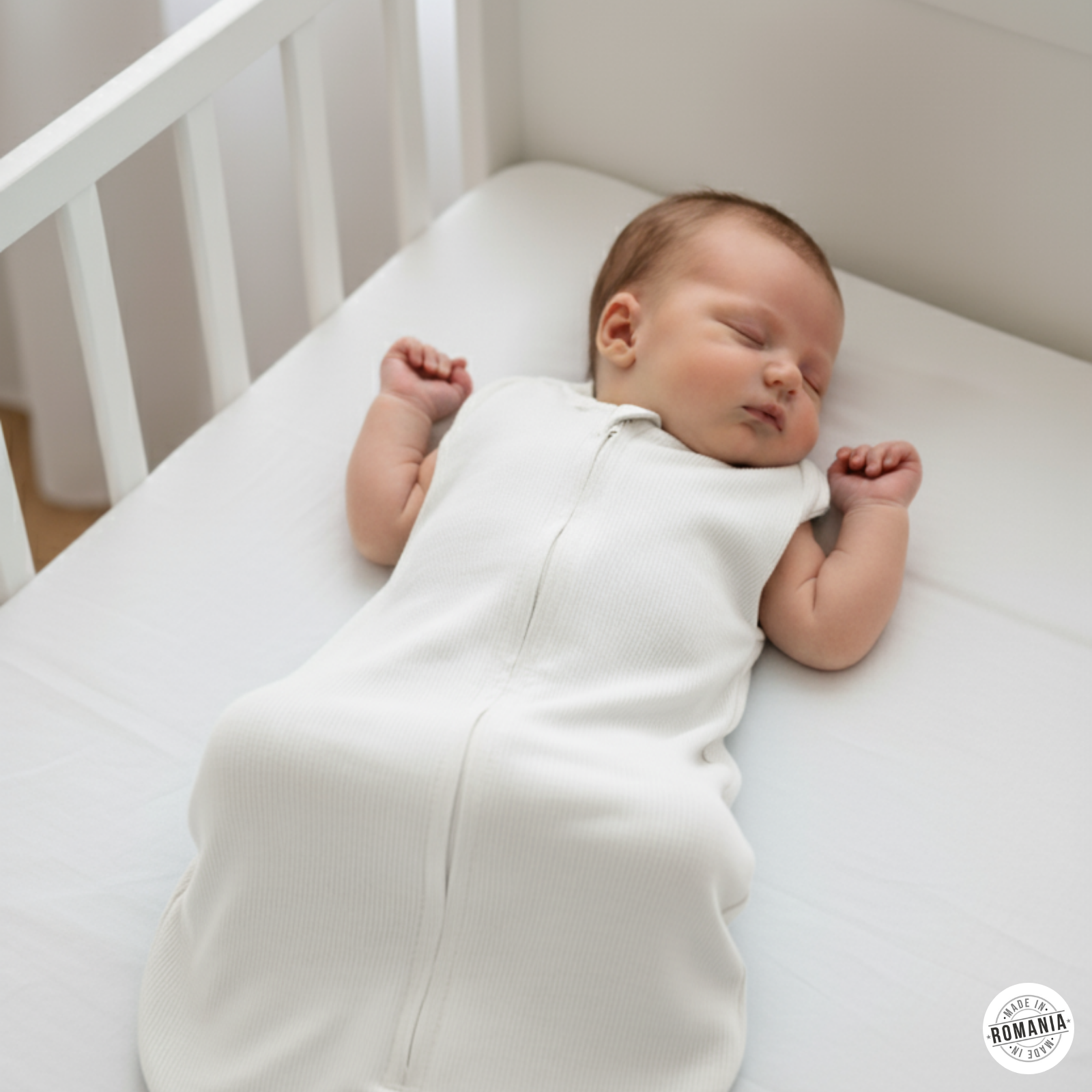 Sistem de înfășat inovator 2-în-1 (Alb): Ajută la prevenirea reflexului Moro și imită senzația de siguranță din uter, asigurând un somn mai lung și mai odihnitor. Poate fi folosit ca sistem clasic de înfășat (cu brațele în interior) sau ca un sac de dormit cu brațe libere, datorită capselor laterale la mâneci care oferă o tranziție lină pe măsură ce bebelușul crește. Echipat cu fermoar, permite schimbarea scutecului pe timpul nopții fără a fi nevoie să desfaceți complet sistemul.