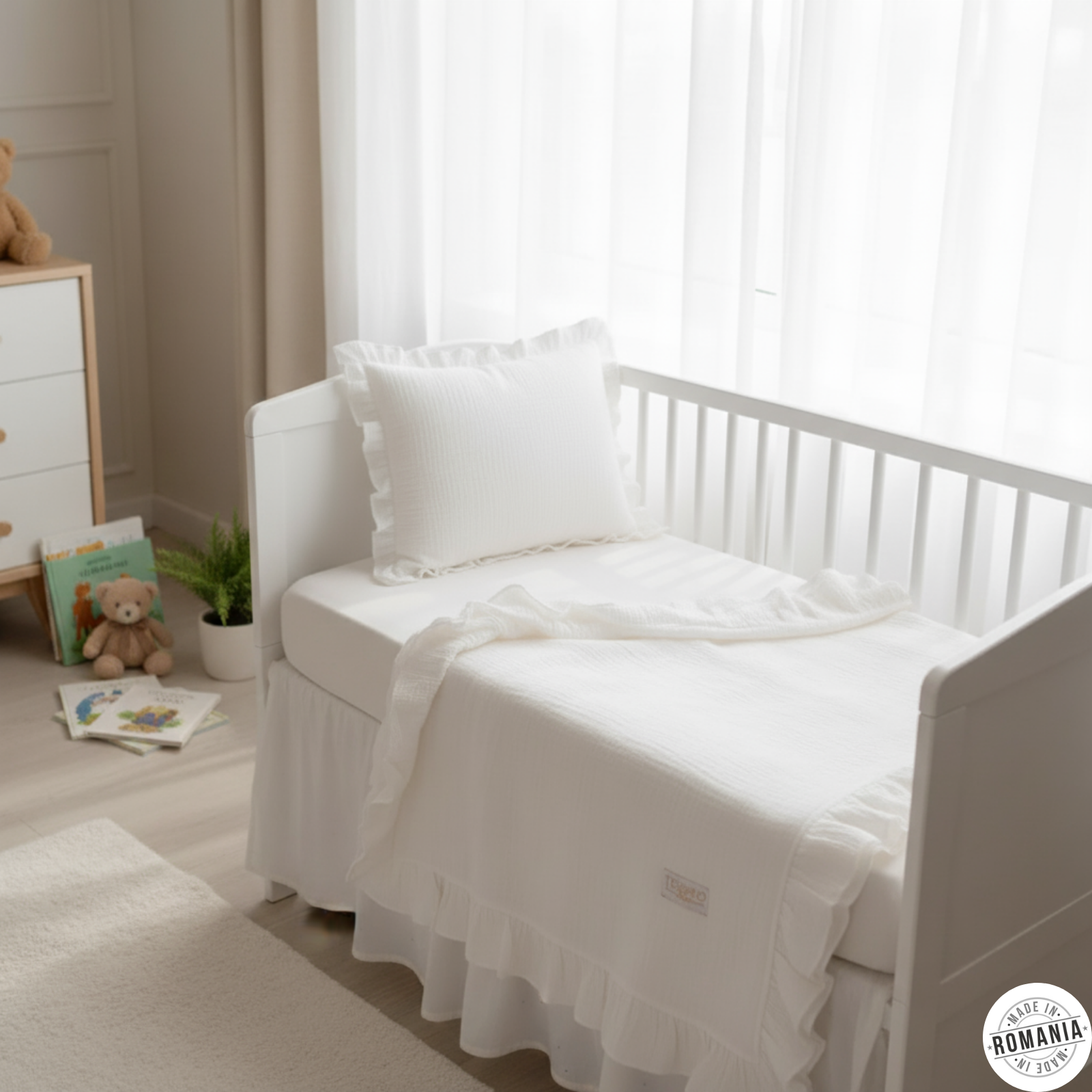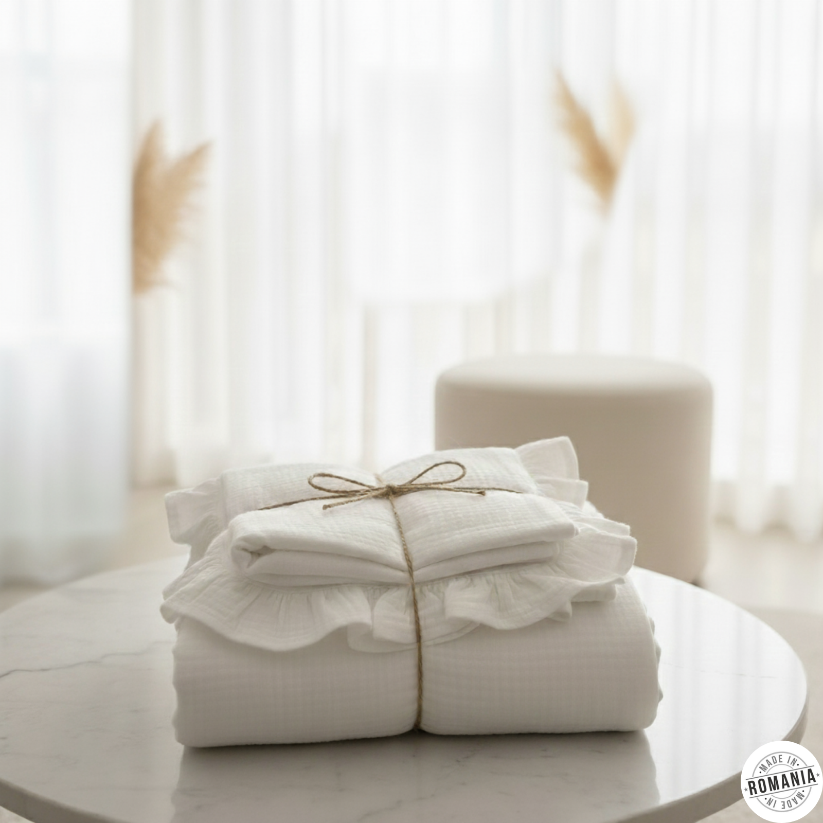 - O patura pentru bebelusi din muselina cu volan, in 4 straturi.