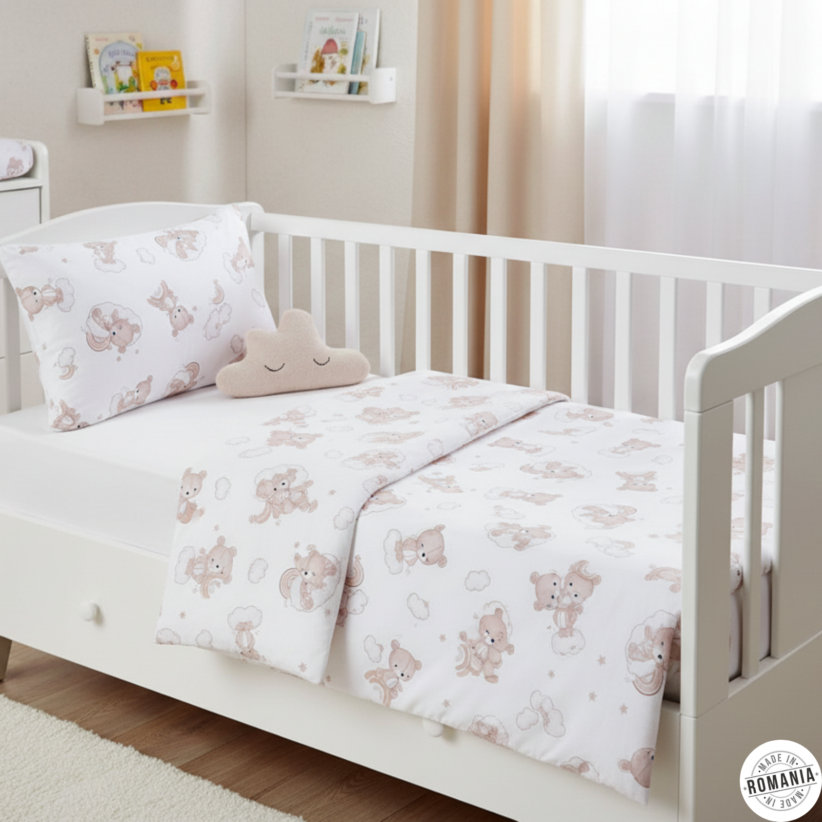 Imprimeul cu ursuleti in culori calde si contrastante atrag atentia copilului, stimulandu-i imaginatia si ajutandu-l sa se simta in siguranta si protejat. Lenjeria este usor de intretinut, fiind lavabila la masina, astfel incat sa iti poti pastra intotdeauna patul bebelusului curat si igienic.