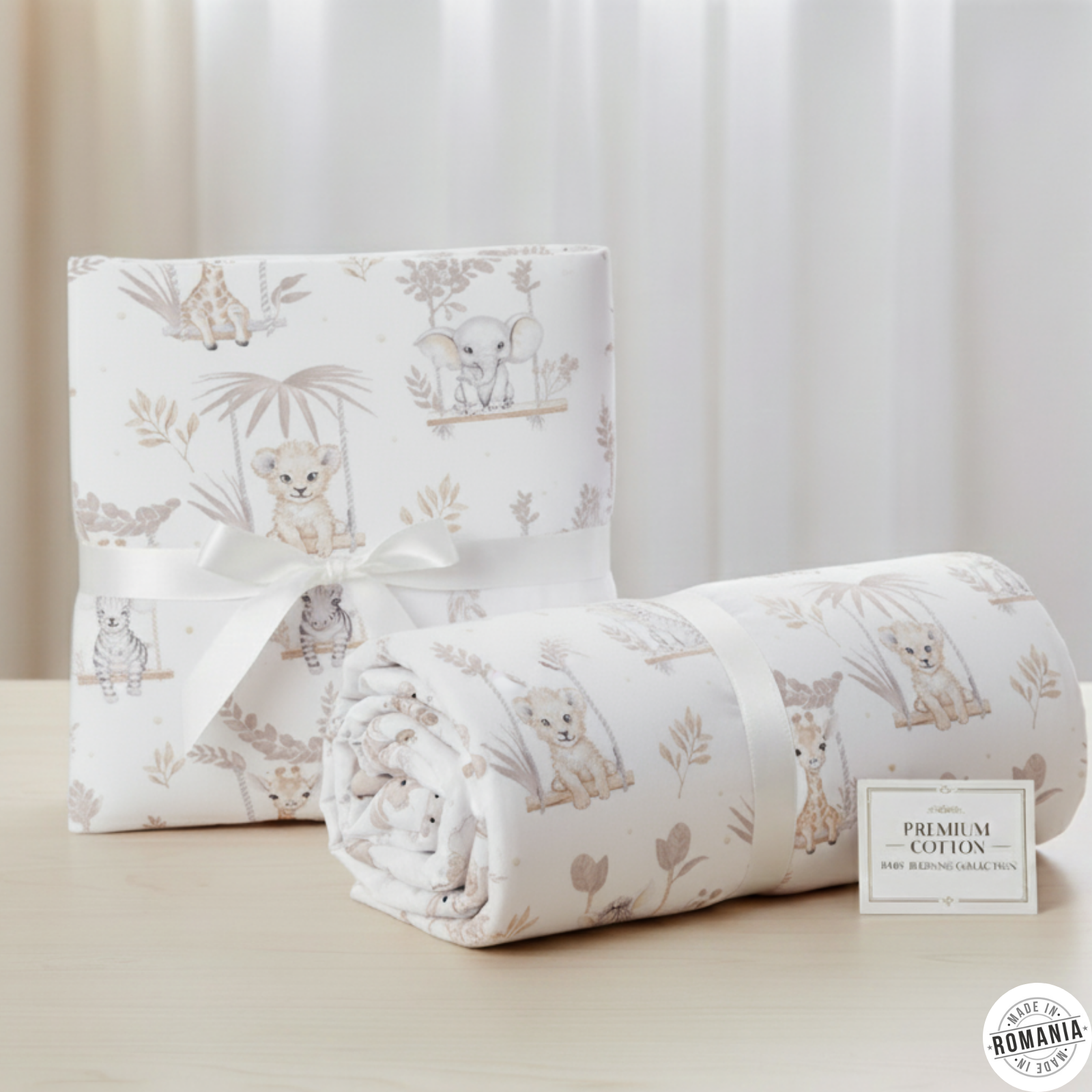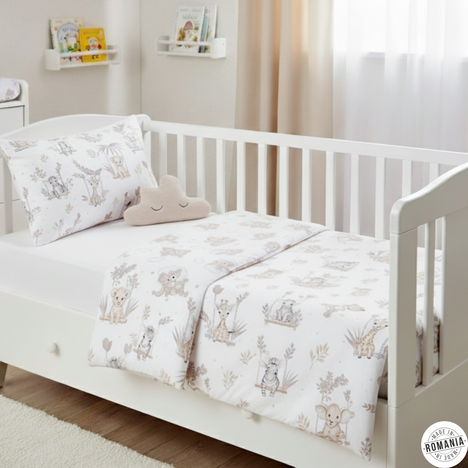 Imprimeul cu animale din zoo include desene cu elefanti, lei, girafe si alte animale simpatice, iar culorile calde si contrastante atrag atentia copilului, stimulandu-i imaginatia si ajutandu-l sa se simta in siguranta si protejat. Lenjeria este usor de intretinut, fiind lavabila la masina, astfel incat sa iti poti pastra intotdeauna patul bebelusului curat si igienic.