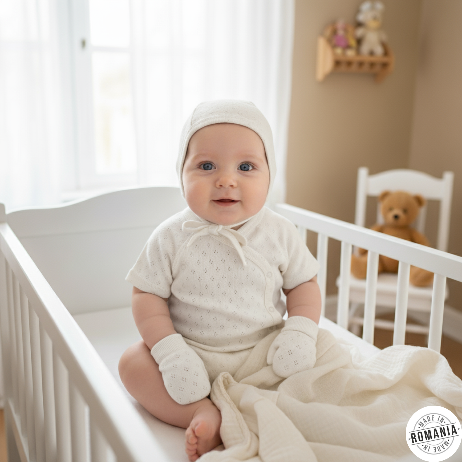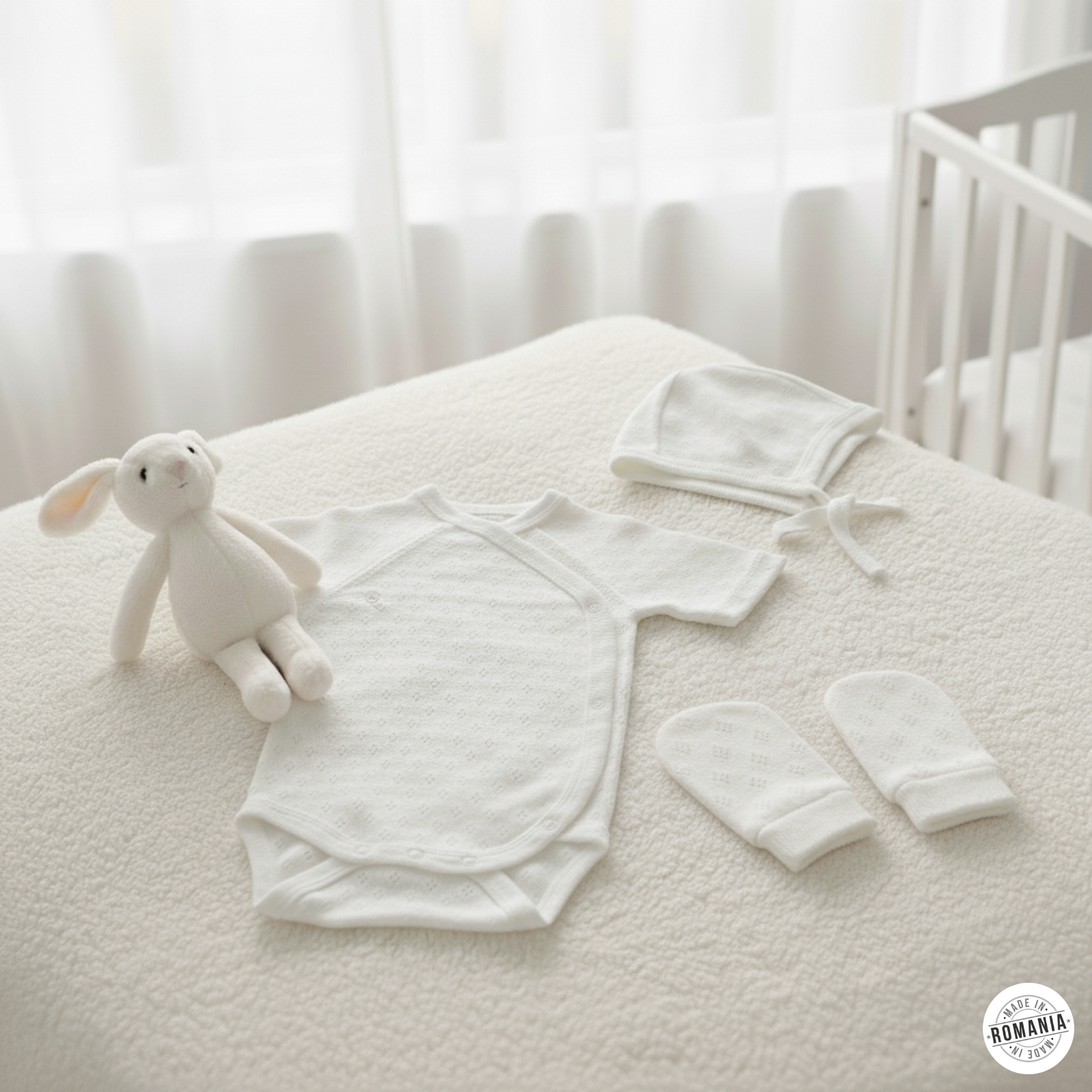 • Hipoalergenic si delicat: Toate cele trei piese sunt realizate din materiale de inalta calitate, hipoalergenice si extrem de delicate cu pielea sensibila a nou-nascutului, reducand riscul de iritatii.